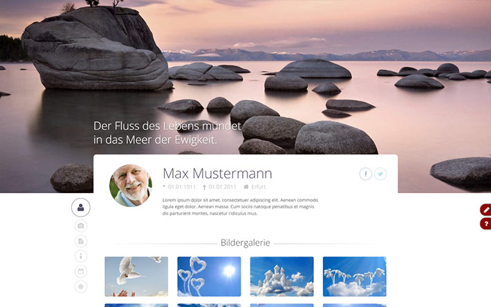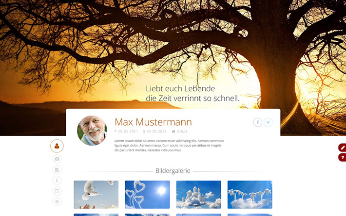 Die Darstellung des Lebenslaufes des Verstorbenen erfolgt über einen Zeitstrahl mittels Bildern und Texten inklusive der Möglichkeit, Drittanbieterinhalte (YouTube, Instagram, Wikipedia, Twitter, etc.) zu integrieren.